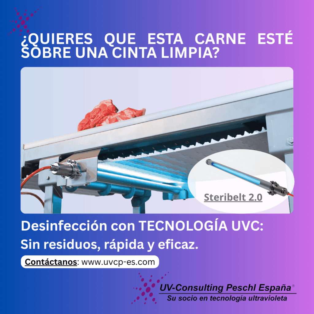 La desinfección de superficies juega un papel muy importante cuando estamos hablando de alimentos. En la industria cárnica, garantizar la inocuidad alimentaria es un reto constante. Las cintas transportadoras, al estar en contacto directo con carnes y subproductos, son un punto crítico de contaminación cruzada. Una alternativa cada vez más adoptada es la desinfección mediante lámparas UV-C. Esta tecnología utiliza longitudes de onda alrededor de los 254 nm, capaces de inactivar bacterias, virus, mohos y levaduras al dañar su material genético, sin necesidad de químicos ni calor.