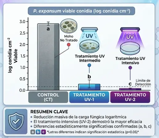 - Desinfección superficial de las manzanas previa al almacenamiento: La irradiación UV-C logró inactivar más del 99,9% de los conidios viables de P. expansum en la piel de la fruta.