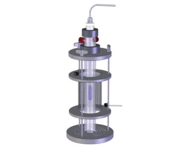 Tubular UV light photochemical reactor. The length of the tube coiled around the light source allows for precise control of the radiation dose received by the liquid and enables detailed study of reaction kinetics.